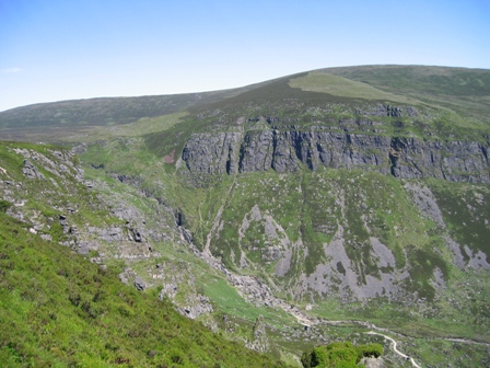 It is an easy walk from the car park along the path that meanders across a raised plateau above the valley through which the Mahon River (An Mhachain) flows. Mahon Falls is the main attraction of the coum. During full flows the falls are truly spectacular as they rage violently, drenching the surrounding boulders. The flora is not as good as in any of the other coums of the Comeragh Mountains. In spring the north facing wall is often ablaze with yellow Primroses. Wilson’s Filmy-fern also grows on this wall as does Fir Clubmoss, Great Wood-rush and a lone Pedunculate Oak.