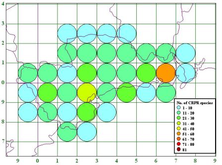 Coincidence map showing the tetrad distribution of CRPR species in County Waterford using data from 2000 onwards