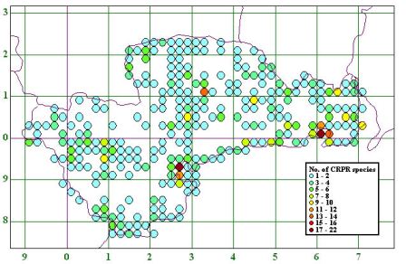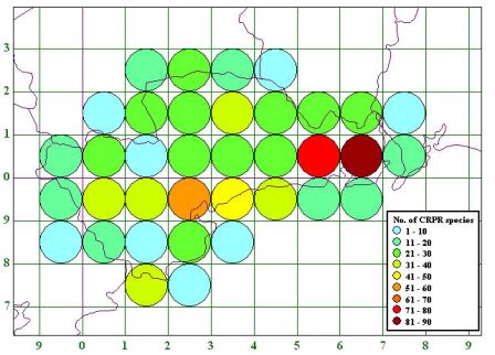 Coincidence map showing the 10km square distribution of CRPR species in County Waterford using all available data